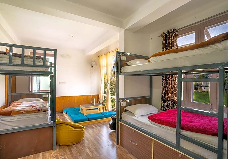 This bed in dormitory has a balcony, seating area and tile/marble floor.